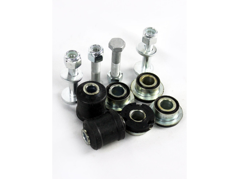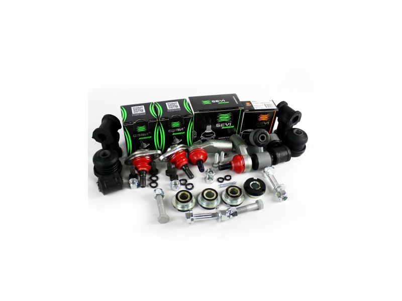 Шарниры рычагов передней подвески (1207) - 2шт Комплект подушек стабилизатора (2208) - 2шт Стойки стабилизатора (2206) - 2шт Шарниры кронштейна растяжки (2301) - 2шт Шарниры растяжки (2304) - 4шт Рулевые наконечники (7058) - 2шт Шаровые опоры (7009) - 2шт Развальные болты - 4шт